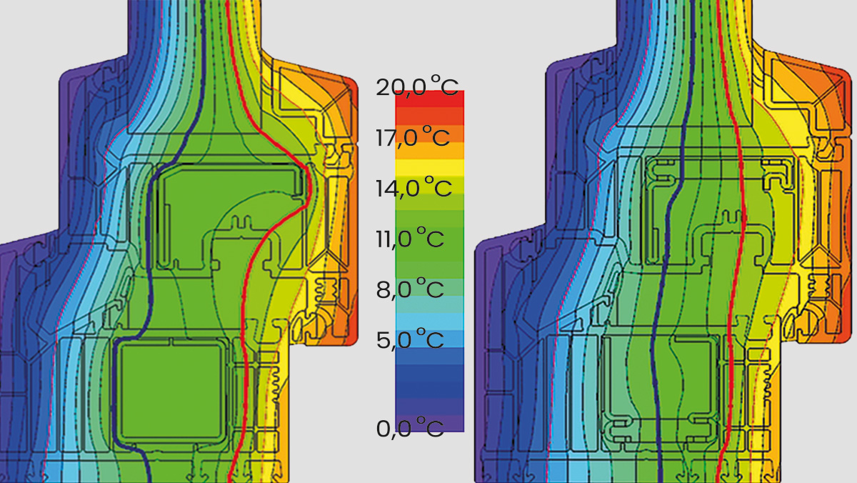 La diferencia en la curva isotérmica de una sección transversal de ventana se hace claramente visible mediante el uso de perfiles con separación térmica. Mientras que los perfiles de refuerzo convencionales forman puentes térmicos, nuestros perfiles con separación térmica, certificados por el instituto de tecnología de ventanas ift, crean una barrera contra las pérdidas de calor.